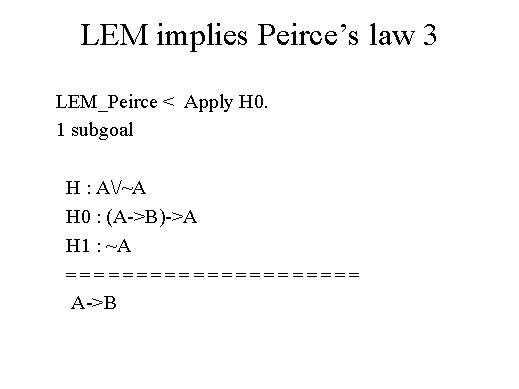 I try to apply H0. I have to prove A implies B from these assumptions. But now it is quite easy, because at this point I only have to prove B from A. Well, this means that I may assume A and prove B.