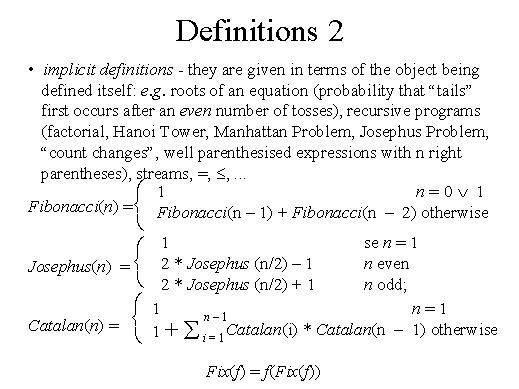 | So we have the Josephus problem, then another interesting example is the one that we had discussed in the lecture on Standard ML, that is the function that counts the different ways in which you can change a given amount of money. And then the well-parenthesised expression with n right parenthesis, or streams or equal or less than or equal. Now look at, for instance, as Fibonacci, Josephus and Catalan(n) look at how these are described. It is rather natural. What we are doing here we are just giving a specification. If you compare these definitions to the ones of the previous page just think that Catalan gives you the number of different expressions of well-parenthesised expressions with n open parenthesis. Of course this is rather easy because if you have just one open parenthesis then you have just one expression. If you have n plus 1 expressions, well how do you create such expressions? Well, either you have an outermost pair of brackets or otherwise you can split your well-formed expression in two sub-expressions each consisting of a smaller number of right expressions. This is essentially the definition. And this definitions seems magical. It gives a very easy way of describing such a function. Similar examples are listed here. I would really like for all the students to work out these examples because this is a very interesting list which really gives a feel for the kind of difference that there is and how much more easy it is to write an implicit definition rather than an explicit definition. |