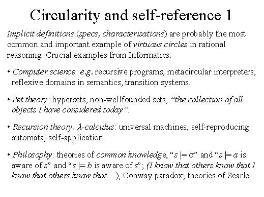 | So indeed it is the case that circularity and self-reference appear under many areas in rational thinking. And implicit definitions are probably the most common and important examples of virtuous circles in rational reasoning. And indeed it is all the idea of functional programming is to build upon and to capitalise on how much easier it is to define things circularly. But there are many crucial examples from informatics, but they are not only form computer sciences, so let's just have a quick look at other situations where you have recursive circular definitions. Of course recursive programmes, metacircular interpreters, reflexive domains, but in set theory we have hypersets. Just think of the collection of all objects that I have considered today. Of course we are used to sets which are well founded, but this set is not well founded, it belongs to itself because today I have considered also this set collection. In recursion theory and l calculus we have universal machines, self-reproducing automata and various other situations. In philosophy, in the theories of common knowledge it is very often the case that we have to describe situations which are circular. For instance, I know that others know that I know that others know that I know that. All this is a situation which we cannot describe by just saying that in a given state s the following sigma proposition sigma holds because I also have to say that a is aware of the fact that b is aware of. So all the information s, it is the state s has to satisfy a proposition which speaks about s itself. It would be nice to have time to illustrate Conway's paradox here which is again a paradoxical situation where the difference is really into the fact that some knowledge is common rather than private. In many theories of intentional phenomena we have circularity. |