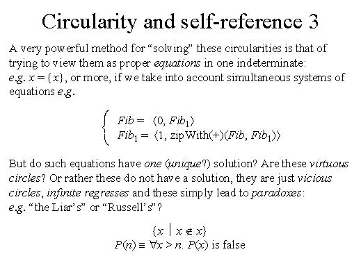 | Consider those phenomena which are influenced by their very announcement like prices, fashion. A very powerful method for "solving" these circularity is that of trying to view them as true proper equations in one indeterminate. Look at a singleton set. Here x is equal to itself, to the singleton set of itself. We can view this as an equation. With one indeterminate or more if for instance we take into account simultaneous systems of equations. And this is a way of writing the stream of Fibonacci numbers by just writing a set of two simultaneous equations with an operator which manipulates streams. But the fundamental question is the following: Do such equations have one unique solution? Are these virtuous circles? Or rather these equations do not have any solution at all. They are just vicious circles. Infinite regressive. And these expressions simply lead to paradoxes like liar's paradox. Here is a version of liar's paradox that perhaps people are not so familiar with. You see here there is not even self reference. The sentence P of n says something about all the sentences P of x for x greater than n. But nevertheless even if this is not a circular, a completely circular definition still it is a paradox. So as you see it appears that being able to define functions or defining concepts in terms of themselves, that is implicitly, makes life very easy. But it may happen that some of these circularities are indeed vicious, they do not define anything. |