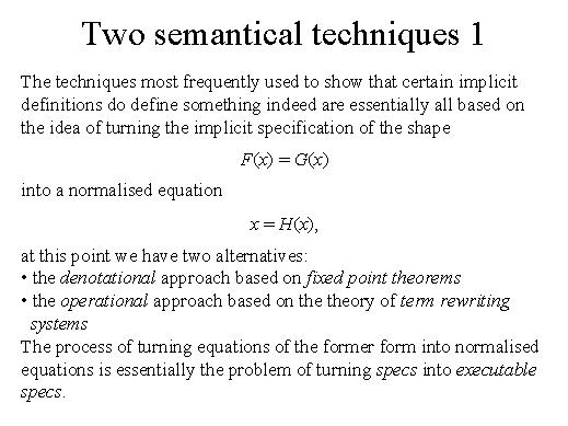 | So, how are we going to make any sense of this. Well, here comes all the theory of the semantics of functional programming languages. And the techniques most frequently used to show that certain implicitly definitions, circular definitions, do indeed define something are essentially based on the idea of turning the implicit specification which is normally something of the shape: F of x is equal to G of x, into a normalised equation which is something of this form. And at this point we have two alternatives: we have the denotational approach based on fixed-point theorems and the operational approach based on the theory of term rewriting systems. These are the two main set ways of giving semantics to functional languages. Let me just point out that the process of turning equations of the former form, that is this form, into normalised equations is essentially the problem of turning specifications into executable specifications. Of course the dream of any programming language would be just to be able to write any odd specification and by just applying some transformation turn it into an executable specification. |