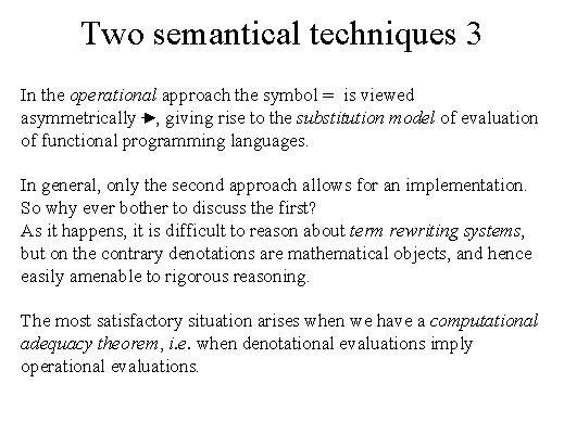 | In the operational approach what we do is turn the symbol equality into an arrow. We view this asymmetrically. And so we give rise to what is called a substitution model of evaluation of functional programming languages whereby essentially we view this expression as a way of replacing all syntactic occurrences of the symbol x with the expanded form H of x. And we keep expanding, keep expanding, keep expanding until in the end we cannot expand any further. In general only this second approach allows for an implementation and this is essentially the way in which all functional programming languages are implemented. But why do we ever bother then to discuss the first approach, the denotational approach? Well, as it happens it is difficult to reason about term rewriting systems, but on the contrary denotationants, that is fixed points, are mathematical objects and hence they are easily amenable to rigorous reasoning. So the whole success of functional programming lies in this fact, that we have two ways of reading a functional programme. One is an operational way which admits evaluation and the other one is a denotational way in terms of fixed points which admits rigorous mathematical reasoning. So, let's have a look at fixed point theorems. |