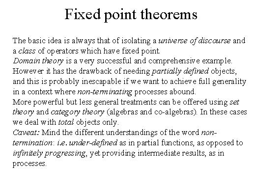 | The basic idea is always that of isolating a universe of this course and a class of operators which have a fixed point. The main theory is a very successful and comprehensive example of universal discourse which admits interesting fixed-point theorems. However, it has the drawback of needing partially defined objects. And this is probably inescapable if we want to discuss complete functional languages. But more powerful approaches, and unfortunately less general, can be offered using set theory and category theory, especially the theory of algebra co-algebras. In these cases we deal only with total objects. Let me just point out a caveat here: mind the different understanding of the word non-termination. Sometimes it means underdefined as is the case when we work in domain theory, other times we mean non-termination as in a stream of inputs that is still something which is defined but it is infinitely progressing for example an operating system is something which of course if it works must be non-terminating otherwise the machine gets stuck. But still it does provide something so it is an infinitely progressing function. |