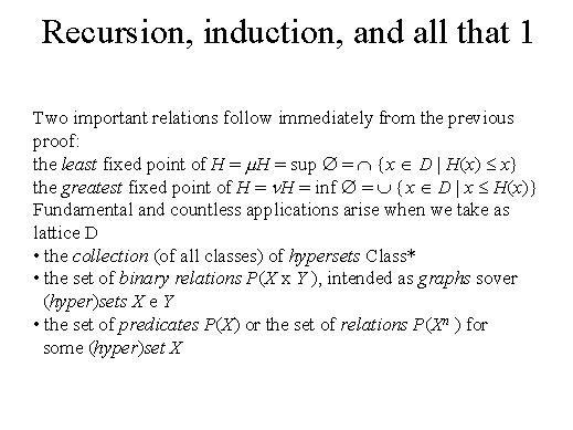 | This slide explains more clearly this concept and as you see the least fixed point and the greatest fixed point can be seen in one case as the least such object and in this case as the greatest such object. So in order to show that something belongs to a greatest fixed point we just need to show that it belongs to some post fixed-point. In order to show that something belongs to some least fixed-point we just need to show that it belongs to some pre fixed-point. |