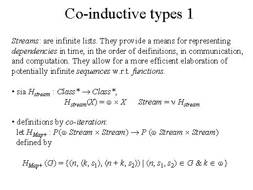| So here we come to the case of co-inductive types. I can only for lack of time browse quickly through these definitions, that is you see here we define streams again as a maximal fixed point over an operator. And we can define the function Map over streams as the greatest fixed point of a given operator on relations. |