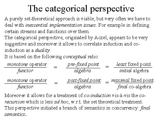 | I would like to end this lecture by just giving a very brief glimpse of how all this can be understood and explained using a very abstract theory which is category theory. Category theory can be seen as the generalisation of set theory and partial order theory. As we see a purely set theoretical approach is viable as the one we carried out earlier, but very often we have to deal with inessential implementation issues. Now, for example in defining certain streams and functions over streams we really have to get down to the fine details. In the categorical approach we can abstract from many of these details, and moreover, the categorical approach allows us to be very suggestive and to correlate induction and co-induction in terms of duality. So here I only have time to illustrate the idea again using some conceptual ratios. So the relationship running between monotone operator and functor is the same that runs between a pre-fixed point and an algebra, but least fixed point and an initial algebra. Monotone operator or a functor are post-fixed point and a co-algebra and a maximal fixed point and a final co-algebra. We can view co-induction as an example of co-recursion. Yes, let me just illustrate this co-algebraic approach by pointing out the following conceptual ratio. The relationship running between monotone operator and functor is the same relationship that runs between pre-fixed point and algebra. The same relationship that we have between least fixed point and initial algebra. On the dual side we will have that this relationship is precisely the relationship between post fixed point and co-algebra and maximal fixed point and final co-algebra. Moreover, category theory allows for a treatment of co-induction vis-à-vis co-recursion, which is less ad hoc with respect to the purely set theoretical approach. This perspective has initiated a branch of semantics of concurrency which is called final semantics. Of course this brings us to an end of this second lecture and of course I would just like to just mention that the fact that on the newspaper there was the solution to the exercise that I had set in class of course it was a very peculiar coincidence, but still I think we should consider it as a very positive omen to the course. |