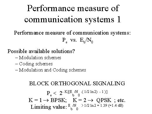 The possible solutions for having minimum probability of error are good modulation schemes, good encoding schemes, or a combination of modulation and encoding schemes. If I consider only the models and the schemes one of the optimal methods by means of which modulation schemes can be implemented is in the form of block orthogonal signalling; where one can find out that the priority of error expression is bounded by the expression on the right hand side, where the value of K will be 1 for BPSK. The value of K will be 2 = for QPSK, etc., and therefore, if we want to keep the exponent positive, than the Eb/N0 must not be greater than 1,4 dB. |