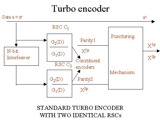 | In turbo code data get to the channel and also gets to recursive systematic called coder. The same data is interleaver and goes to another recursive systematic code called intercode and parity bits out of these are sent to the channel some time one does use puncturing to increase the code rate. A standard turbo code encoder uses two identical RSCs in this diagram shown as C1 and C2. |