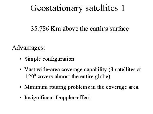 When we talk of geostationary satellites, which are typically 36.000 kilometres above the surface of the earth, the advantages are that they have a very simple configuration, they can cover a very wide area, as a matter of fact, if we have three satellites at 120° to each other, the entire globe could be covered, and it has got minimum routing problems, in the coverage area and, since they are just synchronous, you have insignificant Doppler-effect. |