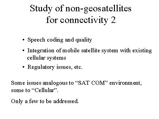 study regulatory issues. There are the issues that have been listed over here, and one could say that some of those issues are typical to any satellite communication system, whereas some of these issues are very typical to, or analogous to, the cellular system, and one can only address a few of them. |