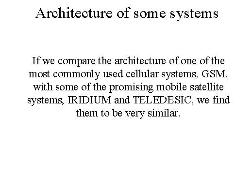 If we consider some of the systems, then especially the IRIDIUM system or TELEDESIC system, one would find out the architecture is almost analogous to the GSM.
