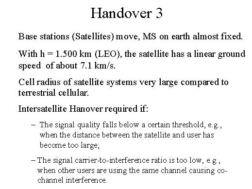 | Typically satellites move at a speed of about 26.000 kilometres per hour, therefore one could think that the mobile on the ground is a stationary, whereas the satellite is moving, and with "h" equal to 1.500 kilometres, the satellite has a linear ground speed of about 7,1 kilometres per second. Inter-satellite hand over are required if the signal quality falls below a certain threshold, when the distance between the satellite and user has become too large, the signal carrier to-interference-ratio is too low, or when other users are using the same channel causing co-channel interference. |