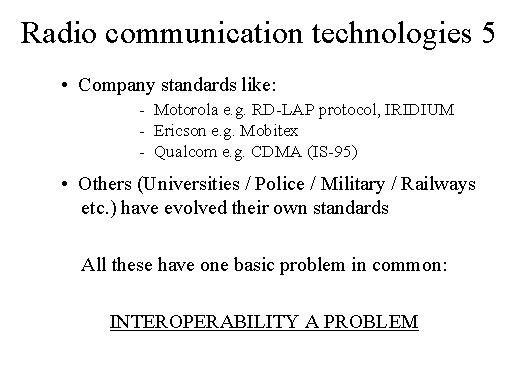 On top of it, if you are a big player, a company like Motorola, you develop your own standard, that becomes de facto a standard, or Ericson or Qualcom, also lot of research goes on in universities, and these follow this or that set of parameters and protocols for accomplishing a certain task. The problem I would like again to repose is the problem of interoperability between one system and another system. |