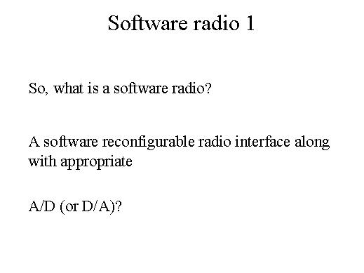 So what is a software radio? A software radio can be defined as a software reconfigurable radio interface along with appropriate A/D and D/A and so on.