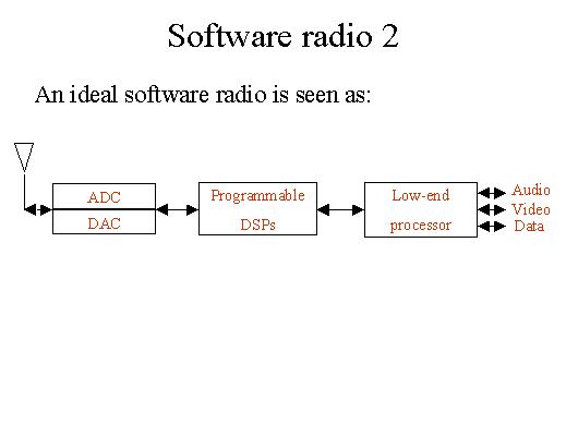 | And it can be seen in the block diagram here in this particular slide. One could start from the transmitter end and say the analogue wayform that is received is converted into digital - at appropriate level - sent to programmable DSPs, for the modulation etc., to effect to learn processer to be given to user either in the audio, video or data-mode. |
