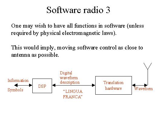 waveform for transmission as well as for reception. This would imply that software control should be as close to antenna as possible, and therefore the diagram on these particular slide shows that it should have DSPs, which will give you a digital wayform and a transmission hardware which will convert it into a wayform and feed it to the antenna. |