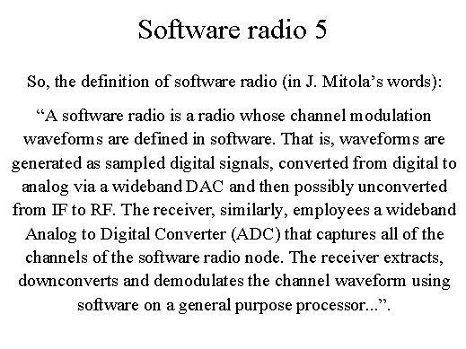 | Software radio was first defined by J. Mitola in 1995, when he said: "a software radio is a radio whose channel modulation waveforms are defined in software, that is, where forms are generated, as example digital signals, converted from digital to analogue via a wideband DAC, and then possibly are converted from IF to RF. The receiver, similarly, employees a wide band Analogue Digital Converter that captures all of the channels of the software radio mode. The receiver extracts downconverts and demodulates the channel waveform using software of a general purpose processor". |