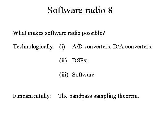 Software radios to make it possible, it will depend, or it depends on three technologies: A/D converters, D/A converters, DSPs and software. But the fundamental thing is the Shannon sampling theorem.