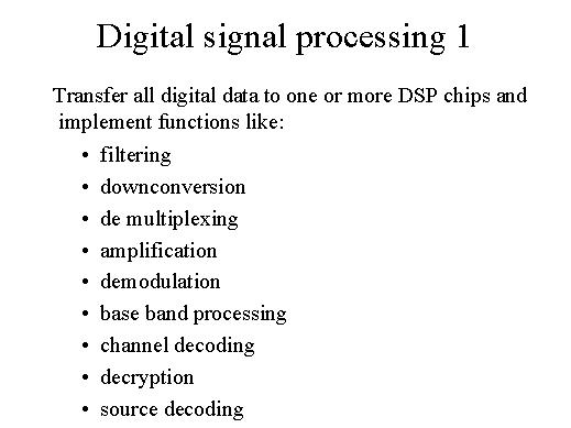 | Similarly, when we talk of DSPs, one would like to tranfer all digital data to one or more DSP chips and implement functions like filtering, modulation and demodulation, base-band processing, channel encoding and decoding, decryption and inscription, and source encoding and decoding. |