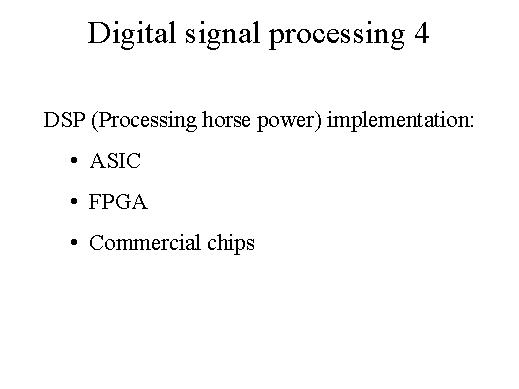 | So, what do you do if you were to implement it today? You would like to have an hybrid approach, that is you have a specialised digital hardware to perform a specific task, and you will use bank of DSPs using ASIC, FPGA and commercial chips are available on all of these to some extent. |