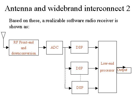 Based on these one could think of a software radio realisation in the form of a diagram, shown over here, where you have got a bank of DSPs and a low-end processor to give you the realisation of software radio.