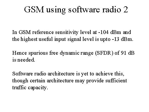 software radio is of the order of 91 dB. Today the A/D and D/A dynamic range is not of this kind and therefore we have to wait till technology gives us this possibility. |
