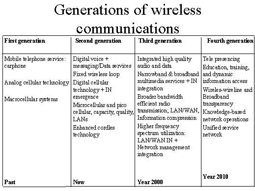 digital voice messaging and data services were also included. In the same second generation, we also have the fixed wireless local loops in a recent to the mobile telephony and the intelligent networking capabilities just started emerging. We split the cells and we had the microcellular and picocellular systems, which could increase the capacity and the quality. The various local area networks also developed during that time, and we had the advanced enhanced cordless telephony and technology. This is the second generation, where we have the most important and most popular system as the GSM, developed by European Community. Similarly we have American digital system and the Japanese digital system, and that is now. In the year 2000 onwards we expect to have the third generation of systems, where the high quality audio and data have been integrated, and we have narrowband and broadband multimedia services with the intelligent networking integration. The broader bandwidth has been taken. The radio transmission has been made more efficient and the local area as well as the wide area networking capabilities have been included. This spectrum is raised from the earlier 800-900 MHz band to 1.800-2.000 MHz band and this spectrum utilising efficiency has been improved. The network management has been integrated in the third system and you have the CDMA capabilities could division multiple access capabilities in reason to the time divisible access in the third generation of systems. The forth generation expected to be in 2010 or maybe even earlier will have telepresencing, education training and dynamic information access, wireline and broadband transparency. Whatever we have in the wireline should be available in the wireless mobile systems as well. And the knowledge based network operations will take place improving the system performance and flexibility tremendously and this will be unified service network. |