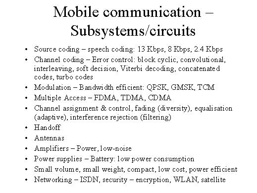 down to 2.4 Kbps per second in future. Another important aspect is the channel coding to protect the speech and the data from noise and channel errors. You have the block evolutional codes and interleaving is used, soft recession techniques are implemented with very useful application for decoding the error control codes. You have today and in future concatenated codes and turbo codes giving better efficiency. Similarly, the third important technique is the modulation, which takes whether it is data or voice into the RF domain, but then you require bandwidth efficient modulation techniques like QPSK, GMSK, TCM. The multiple access plays a very important role because the large number of users have to access the common radio medium and the earlier technique of the FDMA was used in the first generation systems. The second generation systems used the time divisible multiple access, the third generation systems would primarily use CDMA as well as TDMA. Then, very important considerations on techniques on channel assignment and control have to be developed, fading has to be taken care, which is a big problem, equalisation adaptive or non adaptive has to be brought in and interference reduction with the help of filtering and the antennas itself may be quite useful. When the mobile moves from one cell to another hand off becomes a very important consideration and useful and efficient hand off algorithms have been worked out. And they now could be quite small and you require other devices like the amplifiers, both the power amplifiers as well the low noise amplifiers. To have a small volume, small weight and compactness of the mobile terminals we should have low power consumption and small batteries. Then networking the wireless communication becomes very important and the capabilities like ISDN has to be included. |