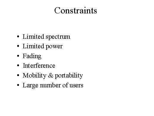 you cannot carry a large amount of power with you in the mobile terminal. Fading because of the urban and the suburban environment creates lots of difficulties. Interference from the co-users and other users because of the frequency reuse is another problem, and mobility and portability are most important service requirements; then the last is the large number of users. |