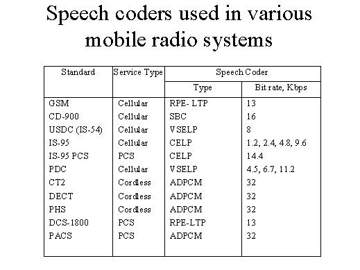 simplified summary of the various speech coders used in mobile communication