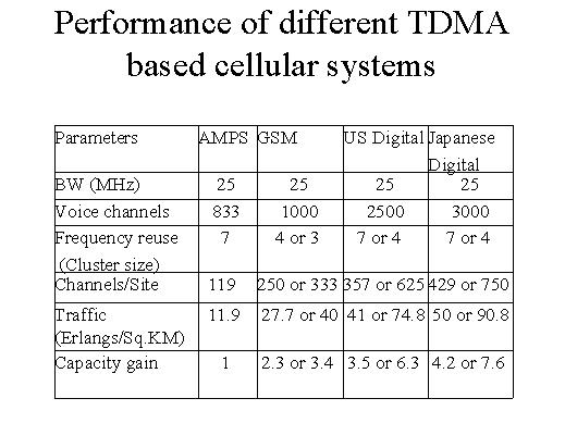 traffic capacity, and the capacity gain. I will be considering primarily the time division multiple access systems, that is the European system, which is GSM, which is very popular, which has large penetration, the US digital and the Japanese digital. These are three time division multiple access systems. In order to find a common base of comparison, I am taking the analogue AMPS system as well. And, again for the sake of simplicity I am considering that all of them have got equal bandwidths, spectrum bandwidths, namely 25 MHz. And thus you find now that the AMPS system support 833 voice channels only, the GSM supports 1.000, US digital support 2.500, and Japanese digital supports 3.000. And that is the advantage of the technology. The frequency reuse, that is the cluster size, the MS has 7, whereas GSM could have either 4 or 3, US digital could have 7 or 4, to make it compatible with the AMPS, and Japanese digital also has either 7 or 4. The channels per side, therefore, you divide by the number of cluster size, therefore it becomes 119 in the AMPS, but it becomes either 250 or 333 in GSM, depending on 4 or 3 being the cluster size; with the US digital number of channels per side becomes either 357 or 625. The digital system has more, namely 429 or 750 channels per side. The traffic capacity similarly is increasing in the various digital systems AMPS have only 7.9 Erlangs per square kilometre, whereas the GSM supports 27.7 to 40 Erlangs and US digital has 41 or 74.8 Erlangs. The Japanese systems gives you 50 or 90.8 Erlangs Well, considering this the capacity gain, taking this as the standard there is no capacity gain in 1, but there is a capacity gain of 2.3 or 3.4 in the GSM. The US digital gives a larger capacity gain 3.5 or 6.3 and the Japanese digital system gives you the highest capacity gain for the TDMA system namely 4.2 or 7.6. I think you have now got a fairly good idea of the various multiple access techniques used in digital and analogue cellular systems. You know that the multiple access techniques and you appreciate that the multiple access techniques play a vital role in making the cellular mobile communication systems possible as they are, because they give you the support, the large number of users which could have communication even though the bandwidth is very limited. |