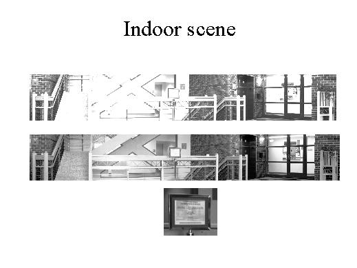 | You can always combine them like this, so you have in an indoor scene various four different images on top. It is a panoramic image where you have a pan taken but different thing are lost in different parts. In the bottom row you have generated - by combining these things - an image which is capturing all these directions without loosing detail because of saturation. |