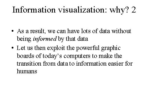 So, what is happening is that although we have lots of data available at cheap prices - for example also through the Internet - we are not being informed by that data. For example, I can easily have a database including every citizen in my nation, the list of all citizens in my nation and I can have this database in my PC, the hard disk allows it, but if I am interested in answering questions such as "What is the state where a given surname is more common?" or "Is this surname completely absent from some states?" or "Are there some people with this surname in the West"? I have either to browse through pages and pages of names and trying to manually draw some point on a map, or I have to come up with a computer program that draws the data, and when I have this program, so when I am able to get in one second or less the map of the nation and some points drawn here and there corresponding to the location of the surname I am interested in, then my lots of data suddenly turn into easily perceivable information, and I can take a look at this map and answer the three questions I mentioned before in a couple of seconds. And finally there is another reason why IV is becoming a hot topic and the reason is that some graphic boards available for today's PCs have the power of the Silicon graphics workstation of five years ago. So, building complex IV applications is now commercially possible. There is a commercial interest towards the field. |