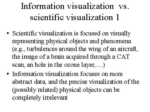 Twenty years ago, some can remember that twenty years ago, there were already big visualization projects in research institutions and these projects produced very useful and significant images for research. For example, very well known images concerned turbulence around the wings of aircrafts to minimise fuel consumption, to understand how to minimise fuel consumption, or medical images acquired through CAT scans, or popular videos of the ozone layer shrinking and enlarging itself in computer animation. So, the question can be: "is there any difference between this scientific research in visualization and what is being proposed by recent IV research"? And the general answer is that IV tends to focus on more abstract data. In scientific visualization usually we have the representation of physical objects, and this representation wants to be a high-fidelity representation, as detailed and realistic as possible, and you have the animation of physical phenomena, such as the ozone layer shrinking. In information visualization you can display information which might be completely abstract, have no physical counterpart, such as web-site access data, or maybe you can visualise information that has some relation with physical objects, for example stock-market data, but you are not interested in representing those physical objects, you are not interested into representing coins and dollar bills when you display stock-market data. |