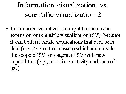 There is some debate about where to draw the line between scientific visualization and information visualization, and some of the founders of IV tend to have a very strong position, they tend to say "OK, if the data is abstract , then it is information visualization; if the data is physical, then it is scientific visualization", but I think we can adopt a more general point of view, where we do not have to take a stand and be on one side or on the other side, we can see this latest development as an extension of what has been done in visualization since twenty years ago because now we can both produce new applications that were not available, such as visual analysis of web-site access, or web-site traffic, which were not considered in scientific visualization, and we can also add new tools to traditional visual scientific visualization applications, for example, we can consider a CAT scan brain image, and we can add a number of tools to interactively explore this image, maybe fly through or easily manipulate, easily remove some parts or change the colour coding of the different parts, and then we can link this image to the medical record of the patient, so we can have a visualization of the abstract information in the medical record, maybe the temporal history of the patient and then this image is linked to, is a detail of this temporal personal history of the patient. Or we can also consider the database where this brain image and thousands of other brain images are stored and come out with some visual language to query that data-base without knowing SQL or some computer specific query language. |