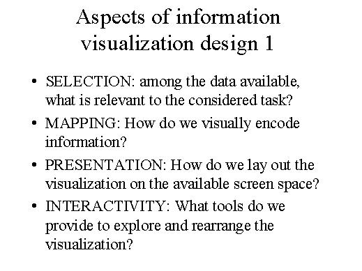 Let's now start to examine what are the different aspects and phases in the design of an IV system. First, there is a selection issue. We have a large number of data available, a large dataset, but we have to ask ourselves which of this data are useful to the currently considered task. For example, if we have a dataset with fiscal data of a number of citizens, with 20 or 30 different variables for each citizen, but we are just interested in seeing who is the richest man in the country maybe it is sufficient to select one variable among all the variables we have recorded in our dataset. |