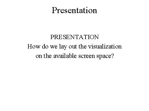 This third problem, the presentation problem, occurs when your visualization is too large to be displayed on the screen you are using in your application. And this happens very frequently when you have a large dataset. So, you have decided how to map your dataset into a visualization, but your visualization is too large to fit the screen. And then you have to use some presentation techniques, for example the fish-eye view. With a fish-eye view, the data in the centre of the screen are magnified, while the data towards the periphery of the screen are compressed. In such a way, you are able to fit all the visualization on a single screen, the user is able to focus on the interesting data, on the data which are of interest in that moment, but the context is not lost. |