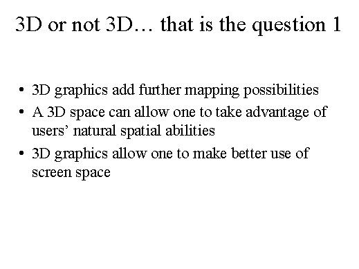 So, although the positions are very strong and supporters of 3-D tend to be very critical of 2-D and viceversa, in this next slide I am trying to summarise the main pros and cons of 3-D with respect to 2-D solutions. First, on the pros side an advantage of adopting 3-D graphics is that they have further mapping possibilities. You can have for example objects which are closer or far away from the user, and this can be used to add further information to our visualization. Moreover when you exploit well the depth dimension that means that you are able to fit more things on the same screen, because things that are far away become smaller. So another advantage of 3-D graphics is that you can approach somehow the presentation problem we have mentioned before, because you fit more parts of your information visualization on the same screen. And finally another typical advantage of working with a 3-D space is that if your 3-D system is implemented well, you can exploit the natural - already known - navigation abilities of people, because people live in a 3-D world, so if you implement appropriately your 3-D space and you can walk on your visualization, you can pick up things, you can move around your head, then the user can reapply her basic navigation abilities coming from the real world. |