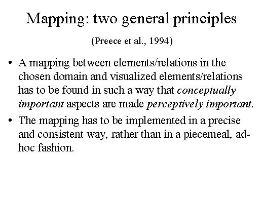 So, a general word about mapping. Two questions that an IV designer should ask himself or herself when designing, when approaching the mapping phase of his project. First he must be aware that the mapping between elements and relations in the dataset and the elements and relations in the visualization has to be always found in such a way that the aspects which are conceptually important in raw data, in the dataset, are made perceptively important by the visualization. So, what is conceptually important has to be immediately, easily perceived by user. It seems almost trivial, but unfortunately IV designers often pursue the goal of providing the system with very impressive graphics, graphics that stand out, but in the pursue of this goal they forget this very important principle, so they produce graphics that are not very intuitive, that are just impressive. But impressive graphics do not allow you to make good decision if it does not follow this principle. And then a second general principle that comes from HCI, but here it is applied to the specific case of mapping is that you have to ask yourself if your mapping has always been implemented in your system in a precise and consistent way. For example, if you use colour coding then you must be aware that your colour code is always followed in the same way, in every alternative visualization you propose on the same screen. Otherwise it would become very easy for the user to get confused. The user would naturally expect that the same colour code is used in every different visualization on the same screen. So these two general principles correspond to two questions that the IV designers should ask himself in every moment of the design of a mapping. |