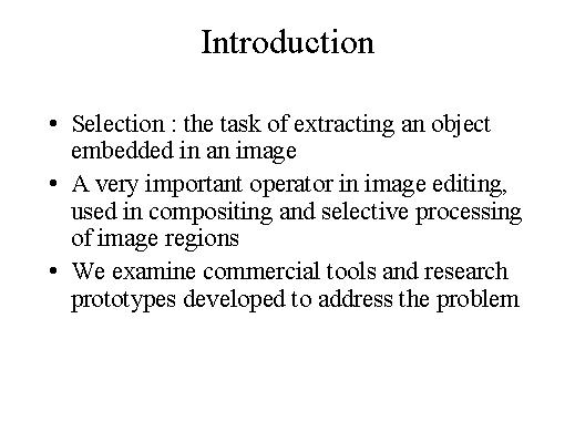 for the humans. The operation of selection is very important in image editing, because when you combine different parts of different images and make a single image, then selection of the correct part of the image is very important. What we will do, we will look at the commercial tools that are available for this purpose and also look at something that we have done ourselves recently which enhances, or which advances the state of the art of object selection. |