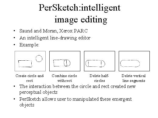 work that was done at Xerox PARC some time ago is of relevance here. They developed a package called PerSketch, which was designed for line-drawings, not for regular images but for line drawings of the kind shown here, where you have cartoon like figures and they are used for illustrating things. So here in the first drawing on the left side we have a circle and a rectangle and the package allows for the circle and the rectangle for that matter any figure to be moved. These figures can be moved, for example circles can be brought near the rectangle, so that a circle over left as the result what we get is a combination and now there are more primitives than just a circle and a rectangle in fact the system then can converte this combination of figures into more primitive description, then you can for example have semi-circles, or you can have access to the individual line segments, and you can eliminate them. |