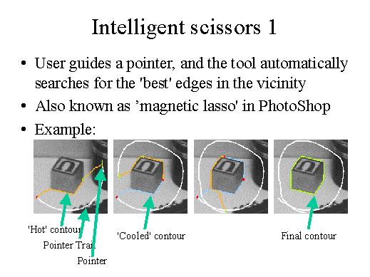 | First intelligent scissors. The user can use a pointer, the mouse for example, and can draw a sketch around the region of interest which is shown in white here, and then that white thing goes into yellow contour because that is the nearest border of the object. In this case the cube border is being selected which is this one. This white goes into the yellow border, and you can have different selections, you can draw different white sketches and get the yellow ones an so on. |
