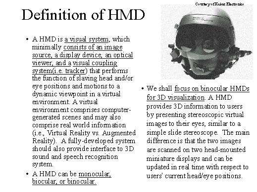 criterion for what has to be sent is user-determined. Then the HMD itself, can have the property of being in monocular, which means you only see something in one eye, or you can see the same thing in both eyes, identical things meaning a repetition of what you saw in one eye into the other, so that really you see the same image twice, or you can have a much more realistic, where you really see two different images which are in a such way transformed that is one image is transformed in a certain way before it is mapped to the display of a second eye, so that these is now a binocular display. These are similar to what we experience, we have two different images reaching our eyes from the reality, so binocular HMDs actually show two different images of the same scene to the two eyes. |