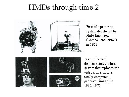 done in 1961. Then Sutherland demonstrated the first system that placed a video signal to the totally computer generated image. That means, not anymore you were showing real images to the person. What was coming to the eye was not real image but a computer synthesised image. |