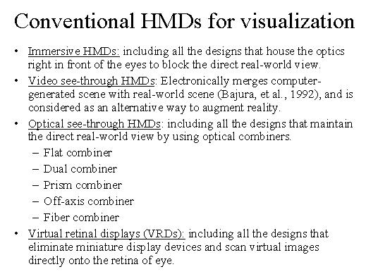 classify the HMDs in the following way. We have immersive HMDs and those are the ones that do not show anything directly from the scene. So the immersive MHDs are showing strictly computer sent images, whether they are real or synthetic is a different issue, but people are only seeing the image on the displays not the images in the real world, so you are not getting direct images from the real world. The second category is a video see-through images, where the computer is merging electronically two things: one is real world images and the other is computer-generated images. So, video see-through HMDs allows the combination of the two. Then optical see-through image MHDs have an interesting property, that they allow that images coming straight from the real world and this is combined with other information. So these allow direct light from the scene and combine that image with another source of images and that combination is done through various kinds of combiners, optical combiners. And finally there are the fourth kind of HMDs, where there is no hardware sticking in front of your eye in the sense that you are not seeing a display or a foreign thing, indeed there is a laser which paints the image directly on your retina through you pupil. So here the display devices are eliminated and the virtual images are actually scanned while a laser on the back your eye on the retina. |