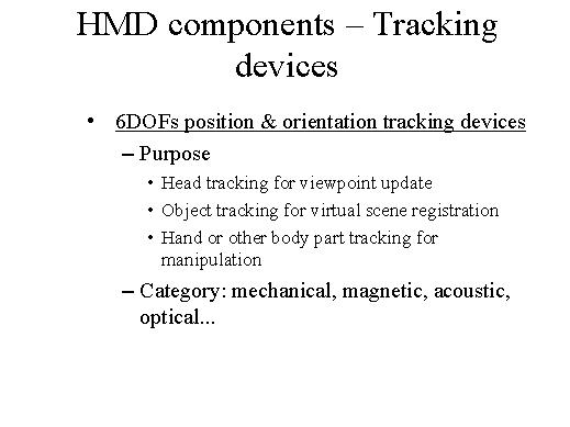 | The tracking device, which we were talking about earlier, consists of six degrees of measurement or six degrees of freedom, for example head location and orientation. So the head is straight to the side exactly what the image is to display, or it also lets you track objects, so that you can do a registration between virtual or real images. And similarly other hands or other body parts can also be tracked. And these trackers can be of different kinds, mechanical, magnetic, acoustic, optical, based upon what technology is used to track these things. |
