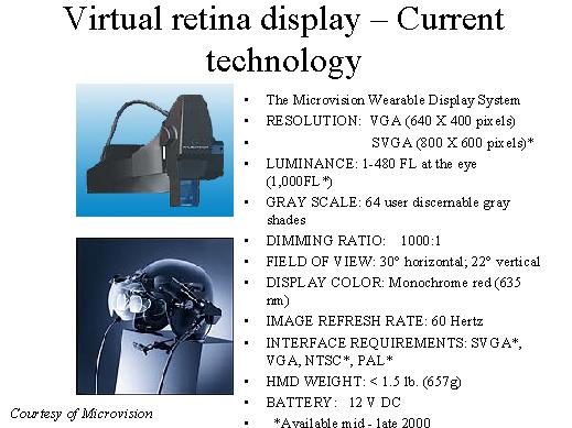 | Here is an example of a device that belongs to this category, virtual retina display. These are some specs of such a device. It has 640 x 400 pixel image or 800 x 600 pixel image, and this is of course a variable system, it has this luminance, this gray scale, 64 user discernable gray shade. |