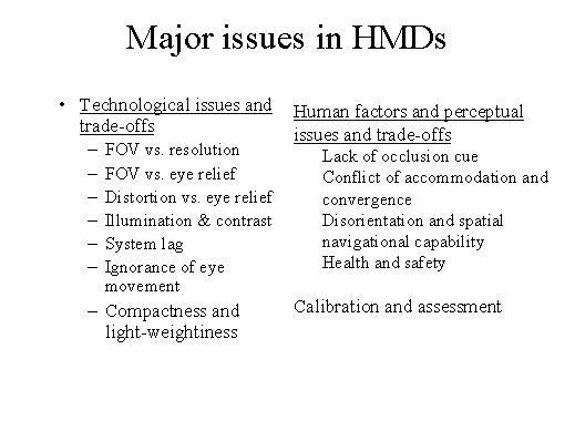 | These are some criteria, some trade-offs, some specs that we use for specifying HMDs. So, I will not go into the specific list, but you can see there is FOV vs. resolution, FOV vs. eye relief, how much distortion you want to allow, how much elimination, how much contrast. So these are parameters along which these things are specified, they describe the performance quality. |