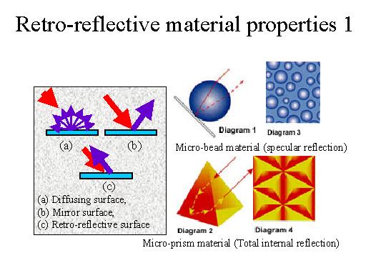 | Retro-reflected screens are defined by these properties. They directly return what is coming in unlike the diffuse screens, which reflect the light in all directions, or specular screens, which reflect the light in a certain fix direction, unlike those two, they just return it along the direction it came from. These are just a couple of technologies that are used to design those reflecting screens. |