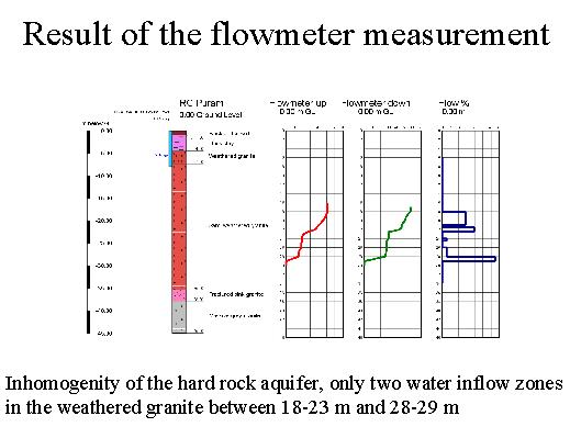 | Some of the investigations were made in the well RC Puram, a area mostly with semi-weathered granite. You can see the inhomogeneous situation of of the hard rock aquifer. We have only two water inflow zones, between 18 to 23 meters and 28 to 29 meters. |